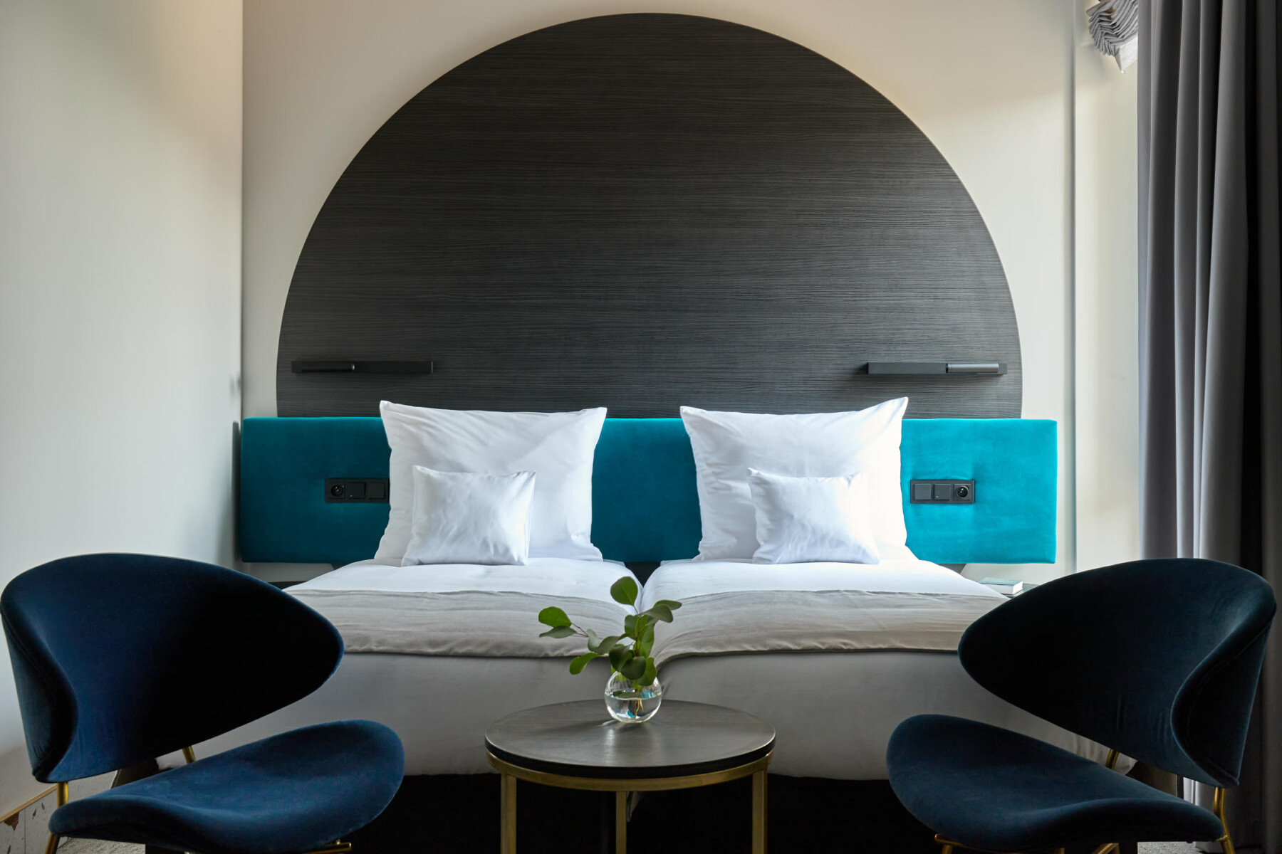 Dzięki wyjątkowej staranności w doborze kolorów, mebli, tkanin i oświetlenia, pokoje Hotelu Liberté 33 łączą komfort i elegancję.